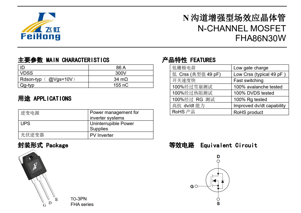 FHA86N30W場效應(yīng)管,是N溝道增強型(VDMOS)場效應(yīng)管。該產(chǎn)品除應(yīng)用在車載專用逆變器外,還可應(yīng)用于戶外儲能電源、MPPT控制器的DC-DC電路中??商娲渌放菩吞枺篒XFH86N30T。