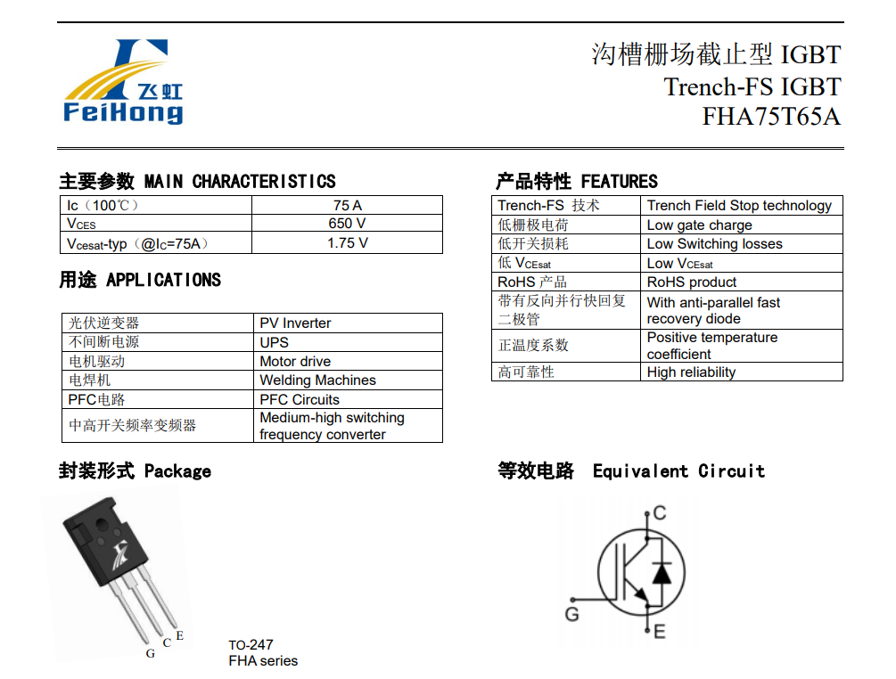 2、FHA75T65A的封裝形式是TO-247,其具有75A, 650V, VCEsat典型值:1.75V,<2.0V;IC (Tc=100℃):75A;Bvces:650V;IF (Tc=25℃):150A;IF (Tc=100℃):75A。