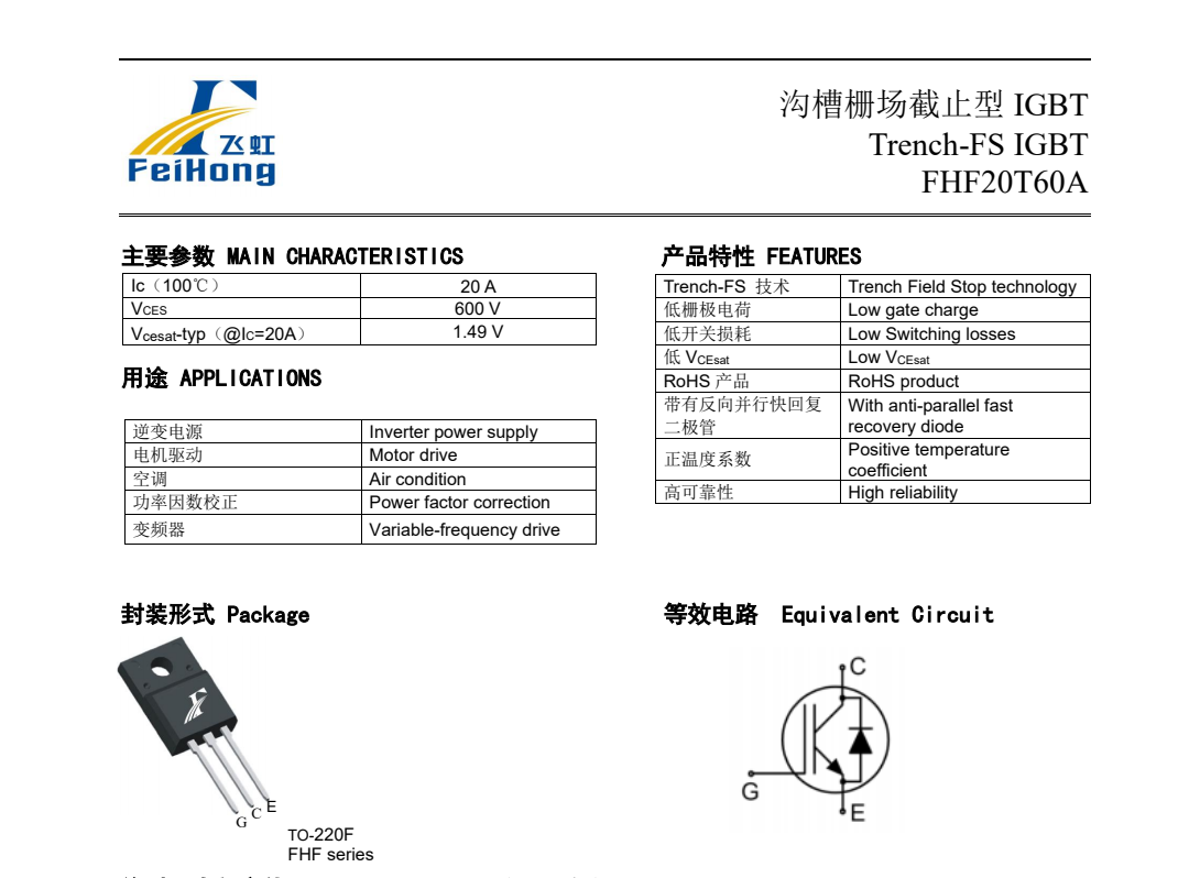 FHF20T60A是一款場(chǎng)N溝道溝槽柵截止型IGBT,使用Trench Field stop Ⅱ technology 和通過(guò)優(yōu)化工藝,來(lái)獲得極低的 VCEsat 飽和壓降。